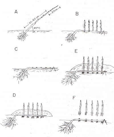 - 80-100 cm boyundaki bir yaşlı köklü damızlık bitkileri, ekolojik bölgelere göre, Aralık-Mart aylarında sıra arası 1.5 m ve sıra üzeri 25 cm aralıklarla, toprakla 450’lik açı yapacak şekilde dikilir. Dikim esnasında 20 cm’lik tepe kısımları kesilir (Şekil 5 A).