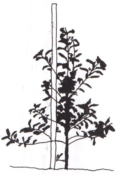 Şekil 9. M 9 anacına aşılı kuvvetli ve ağaç için ağırlık yapacak şekilde dal oluşturulmuş üç yaşlı bir Golden Delicious ağacının ikinci gelişme mevsimi sonundaki görünümü
