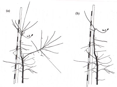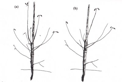 Ağaç dengeli bir gelişme gösterirse, yok denecek kadar az budama yapılır veya hiç yapılmaz. Eğer ağaç 2.5 m’yi geçmişse, genellikle liderin uzantı dalının çıkarılması yeterlidir. Bunun anlamı, liderde uç kesimi yapılmayıp, liderden yeni çıkan sürgünlerden, aşağıdan itibaren birincisi üzerinden kesim yapmak demektir (Şekil 8).