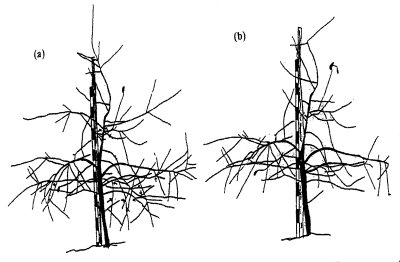 İlk gelişme mevsimi sonunda, ana gövde üzerinde bulunan ve topraktan itibaren 40 cm’ye kadar olan dallar çıkartılır. Yan dallar ilk gelişme mevsiminin sonunda, iple aşağı doğru geniş açı yapacak şekilde bağlanmak veya ağırlık asmak suretiyle eğilirler. Ancak eğilemeyecek kadar çok dik gidenler, budama zamanında tamamen dipten çıkartılır. Yan dallarda hiçbir şekilde uç kesimi yapılmaz.