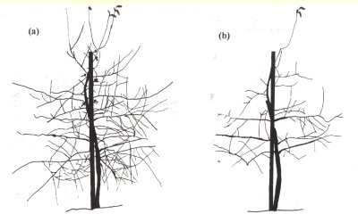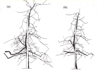 Şekil 13’de bahçe kuruluşundan itibaren özen gösterilmiş ve bunun sonucunda da ideal şekli almış dokuz yaşlı bir Golden Delicious ağacının budamadan önce ve sonraki durumu görülmektedir.