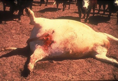 Hastalığın belirtileri: Sığırlarda ve diğer omurgalı hayvanlarda genellikle peracut (çok hızlı) seyreder ve hiç bir belirti göstermeden titreme, çırpınma sonucu ani ölüm meydana gelir. Nadir olarak yavaş seyreder. Böyle durumlarda 41-42 derece ateş, durgunluk, bitkinlik, iştah kesikliği, kıllarda ürperme, titremeler, mukozalarda hiperemi (kanama), önce kabızlık sonra kanlı ishal, sindirim bozukluğu, boyunda şişkinlik ve solunum güçlüğü görülür ve ölümle sonuçlanır.