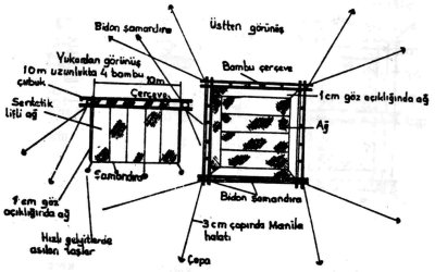 a) Duba, b) Sabitleştirici kazık, c) Bambu çerçeve, d) Kafes eteği, e ) Tel, f) Balık koruma ağı, g ) Yatay urgan, h ) Taban ağı çerçevesi
