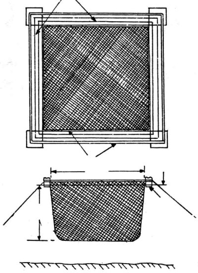 2. havuzun ağ (torba) kısmı; ahşap kısmın boyutlarına uygun olarak yanlardan yarım metre daha kısa olacak şekilde, ağın bir yüzü açık küp şeklinde dikilmesiyle oluşur. Kafes boyutumuz 4 x 4 x 3 m'sine ise ağ kısmı 3.5 x 3.5 x 3 m boyutlarında, 5 x 5 x 3 m ise ağ kısmı 4.5 x 4.5 x 3 m boyutlarında olur. Torba şeklinde dikilen ağın taban köşelerinde ağırlıklar asılarak ağın suyun içinde gergin olarak durması sağlanır. Ağın üst kısmı da yüzdürücülere sıkıca bağlanır.