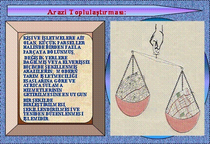 1. Fazla parçalanmış, dağılmış arazilerin modern işletmecilik esaslarına göre birleştirilmesi.