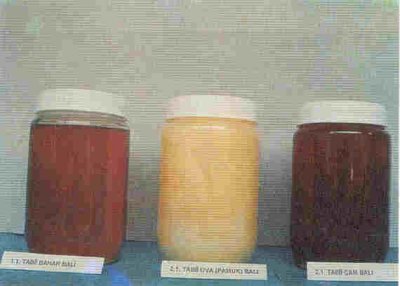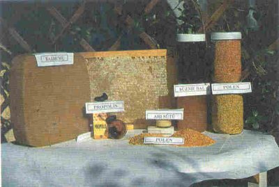 Resim 19. Arı ürünlerinden toplu görünüş. Soldan sağa; polen, süzme bal, petekli bal, bal mumu, propolis ve arı sütü.
