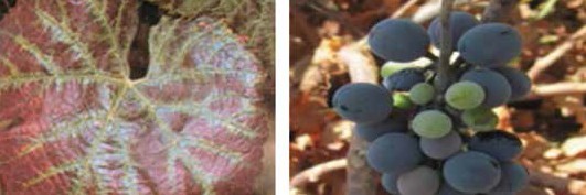 Yaprakta ve Salkımda leafroll virüsü’nün sonbahar belirtisi.