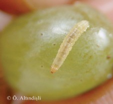 Salkım güvesi bir kelebek olup boyu 6 mm kadardır (Şekil 112). Bu zararlının larvası genellikle sarımsı yeşil renklidir (Şekil 113). Kelebekler ilkbaharda havalar ısınmaya başlayınca görülür. Yıl içerisinde genellikle 3 döl verir. Kışlaktan çıkan dişiler çiftleşir ve nisan-mayıs aylarında yumurtalarını çiçek tomurcuklarına bırakır. Yumurta içinde gelişip çıkan larva çiçek kılıflarını delip tomurcuk veya çiçek içine girer, bazen sapı yiyerek ileride taneleri oluşturacak tomurcukların düşmesine ve seyrek taneli salkım oluşmasına neden olur. Bazen tomurcukları yerken salgıladığı ağlarla bunları birbirine bağlar (Şekil114), aynı yerde pupa olur. Çıkan kelebekler tekrar çiftleşir ve dişiler bu kez ikinci dölün yumurtalarını koruk haline gelen üzümlerin üzerine bırakır. Çıkan larvalar bu korukları delerek, galeri açarak beslenir (Şekil115). Üçüncü döl olgunlaşıp tatlanmaya başlayan danelere yumurta bırkakır. Bu dönemde zararlı ile mücadele edilmez ise olgun tanelerde larvaların açtığı deliklerden dışarı üzümün şekerli suyu akar, açılan yara yerinden başka hastalıklar da girerek zararı artırır, salkımların çürümesi sonucu üzümün pazar değeri düşer (Şekil 116).