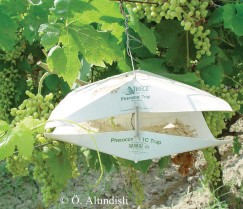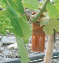 Eşeysel çekici tuzaklar (Şekil 117) uygulama alanının her 50 dekarına 1 adet olmak üzere mart başında asılır. Bu tuzaklarda ilk Salkım güvesi yakalanır yakalanmaz (Şekil 118) yayıcılar bağa yerleştirilmelidir (Şekil 119).