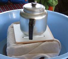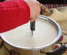 * Kapağı kapatılan süt tenceresi bir bez ile örtülerek 1,5 – 2 saat pıhtılaşmaya bırakılır.