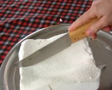 * 5-6 saat sonra süzme bezlerinden çıkartılan peynirler, 3-4 cm kalınlığında kesilir.