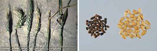 Buğday gal nematodunun yaprak, başak ve tanelerdeki zararı (sol), sağlam taneler (sağ).