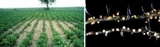 Patates kist nematodunun tarladaki zarar şekli ve Patates kist nematodu dişilerinin köklerdeki görünümü (Anonim 2015, 7d.10)