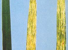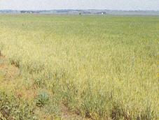 Resim 74. Buğday çizgi mozaik virüsünün buğday yapraklarında oluşturduğu belirtiler (solda) ve bu virüs ile bulaşık buğday tarlasının genel görüntüsü (sağda).