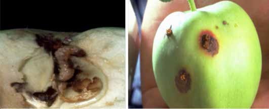 Yumurtadan çıkan larvalar genellikle 4-8 saat içerisinde meyveye girer. Larva meyveye çiçek çukurundan veya elmanın yan tarafı ile sapa yakın kısımlarından içeri girdikten sonra meyvenin merkezine doğru tünel açarak ilerler. Doğrudan meyvede zarar yapan larvalar, meyveleri delerek içlerinde galeriler açmakta, etli kısmını ve çekirdek evini yiyerek pislikler bırakmaktadır (Şekil 23). Bu özelliği ile çekirdekler üzerinde beslenmeyen meyve içinde zararlı olan diğer türlerden ayrılabilmektedir. Zararlı olduğu bitkiler; elma, armut, ayva, ceviz, erik, kayısı ve şeftalidir.