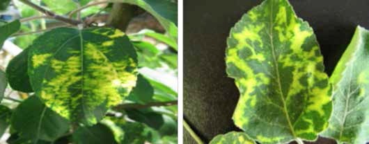 Yaprakta Elma mozayikvirüsü’nün belirtisi,
