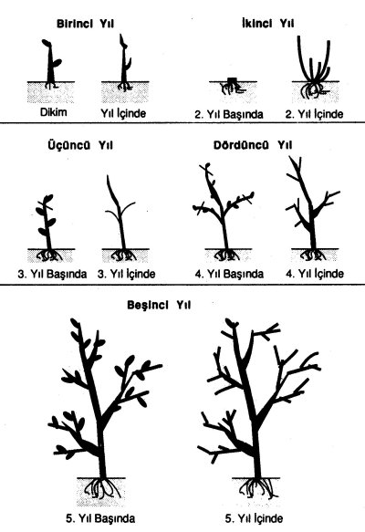 Doruk ve katları oluşturacak sürgünlerin kesiminde dikkat edilecek husus, dışa bakan bir göz üzerinden kesim yapılmasıdır. Beşinci yılın sonunda şekil budaması bitirilmiş olur (Şekil 15).