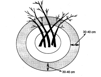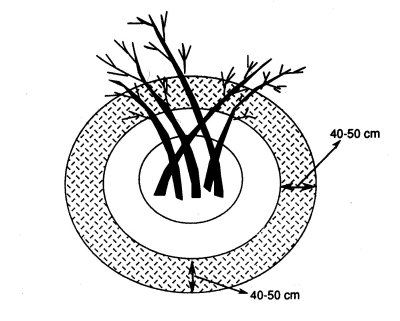 Üreticiler arasında "Kışlık Gübre" olarak bilinen Fosfor ve Potasyumlu gübreler ise kasım - şubat aylar arasında, 3 yılda bir, ocak dal uçları altında açılacak 15-25 cm derinlikteki çukurlara eşit olarak konulup, üzeri toprakla kapatılmalıdır. Bu gübrelerde kesinlikle toprak yüzüne serpilip, açıkta bırakılmamalıdır (Şekil 18).