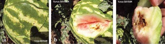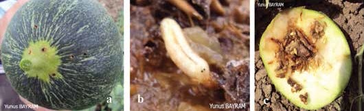 Kavun sineği larvalarının kavun meyvesindeki çıkış delikleri (a) ve meyve içindeki zararı (b ve c).