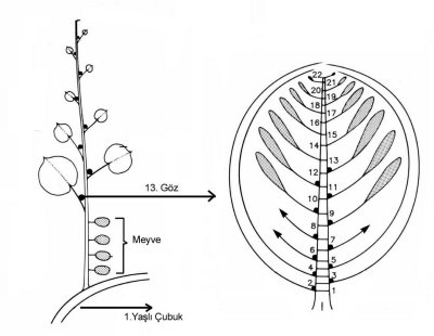 Kış Budaması: Kış budaması yapılırken önce omca üzerinde bulunan fakat varlıkları istenmeyen ters yönde büyümüş, eğilmiş, bükülmüş, birbirini üstlemiş, rüzgardan zarar görmüş dallar, komşu omcaların içerisine kadar girmiş dallar ve kollardan çıkan obur dallar dipten çıkarılır. Çok kuvvetli dallar altında yaz boyunca gölgede kalmış zayıf dallar, zayıf çiçek gözü teşekkül ettirdiklerinden bir sonraki yıl bu dallardan meydana gelen meyveler de zayıf ve kalitesiz olacaktır. Genellikle daha küçük dallar kuvvetli dallara göre daha az sayıda ve daha küçük meyve oluştururlar. Dik büyüyen kuvvetli dallar çoğunlukla tellere bağlanırken kırılırlar. Böyle dallar aşırı geliştiklerinden zamanla diğer dalların gölgede kalmalarına neden olurlar. Ayrıca bu dallar her ne kadar iri ve kaliteli meyveler meydana getirmiş olsa da bu meyveler ana gövdeden çok uzakta teşekkül ettiklerinden arzu edilmezler. Daha sonra omcanın gelişme durumu ve yaşına göre omca üzerinde belirli sayıda çubuk bırakılır. Bu sayı dördüncü yaşta 12, beşinci yaşta 18, altıncı yaşta 24, yedi ve yukarı yaşlarda 30 ile 40 arasında değişir. Çok gerekmedikçe ana kollar üzerinden çıkan kısa boğumlu meyve dallarının budanmamaları gerekir. Çünkü bu dallar çok verimli dallardır. Yaşlı dalların derin budanması gerekir. Eğer normal olarak bırakılacak bir yaşlı dallar arasındaki mesafe 45 cm'den fazla ise bu durumda iki yaşlı dallar da bırakılabilir. Ancak bu dalların bir önceki yıl meyve vermiş gözlerin 2-4 göz ilerisinden budanması gereklidir. Dallar arasında sıkışıklığa yol açmamak için 1-2 bazen 3 yaşlı meyve dallarının omcanın her tarafına eşit bir şekilde dağıtılmasına dikkat edilmelidir. Yaşlı dallar kesildikten sonra eğer geriye yenilenecek dal kalmamış ise bu gibi durumlarda uzunluğu 3-5 cm olan yaşlı dal parçaları bırakılarak bunlardan sonraki yıllar için yeni sürgünler oluşturulması yoluna gidilir. Yeni sürgünler elde edildikten sonra bu dal parçaları uygun yerlerinden kesilip atılmalıdır. Çubuklar seyreltildikten sonra kalan çubukların uçları 10-14 göz üzerinden kısaltılarak uçlarından kenar tellere bağlanır. Eğer kollardan üç ve daha yaşlı dallar varsa bu dalların dipten kesilerek yenilenmesi gerekir (Şekil 16). “Yenilenen Dal” olarak adlandırılan bu dal 15 ile 40 cm kadar ana kollara yakın olmalı ve en az kendisinin üzerinde meydana geldiği yaşlı meye dalı uzunluğunda olmalıdır. Budama, omcanın bir ucundan başlanıp diğer ucuna doğru yapılır. Prensip olarak 1 cm kalınlığındaki dalların tamamında uç alma veya kesme işlemi yapılmalıdır. Bırakılacak dal uzunluğu normal gelişen dallarda 80-100 cm, kuvvetli gelişmiş dallarda 120-150 cm ve zayıf gelişen dallarda 40 cm olmalıdır. Eğer bir önceki yıl meyve verimi az olmuş ise o zaman aynı yıl meyve verimini normalin üstünde beklemek gerekir. Böyle bir durumda bırakılacak dal uzunluğu olması gerekenden 20 cm kadar daha kısa olmalıdır. Böylece daha az sayıda ve fakat daha iri meyve elde edilmesi teşvik edilmiş olacaktır. Tersine olarak bir önceki yıl aşırı miktarda verim elde edilmiş ise aynı yıl az sayıda meyve teşekkül edecek demektir. Bu gibi durumda verimin daha da aşağı düşmemesi için şiddetli budamadan kaçınılmalı dallar normale göre biraz daha uzun bırakılmalıdır. İzlenecek bir başka yöntem de dallar üzerindeki meyve gözlerini sayıp bunlardan %10-14’ünü bırakıp diğerlerini kesmektir. Genel olarak bırakılan bu gözlerin yarısından üzerinde 4-6 adet meyve veya meyve salkımı veren sürgünler elde edilir. örneğin eğer bir dal 10 göz üzerinden budanmış ise bu gözlerin 5 tanesi sürecektir. Her bir sürgünden 5 adet meyve elde edileceğinden bu daldan toplam 25 adet (yaklaşık 2.5 kg) meyve elde edilecek demektir. Bu orana göre normal bir kivi omcasından 75-100 kg meyve elde edilebilir. Bu şekilde bir verim, zamanında sulanmış, bakım ve seyreltme işlemleri usulüne göre yapılmış omcalar için geçerlidir.