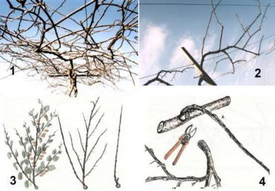 Şekil 16. Budanmamış (1) ve budanmış (2) kivi omcaları, iki yaşlı kivi dalları (3) ve üç yaşlı (4) dallarda dal yenilemeleri.