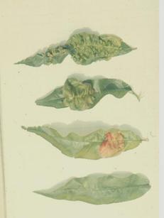 Buna en tipik örnek şeftalide yaprak kıvırcıklığı hastalığıdır. Hastalıklı genç yaprakların rengi önce sarı veya beyazımtıraktır. Daha sonra bu yapraklarda büzülme ve spiral şeklinde bükülme görülür. Bazen hastalıklı yapraklar kırmızımtırak veya şarap tortusu rengine dönüşebilir. Hastalıklı bölümler sert, kırılgan ve normal yapraklardan daha kalındır.