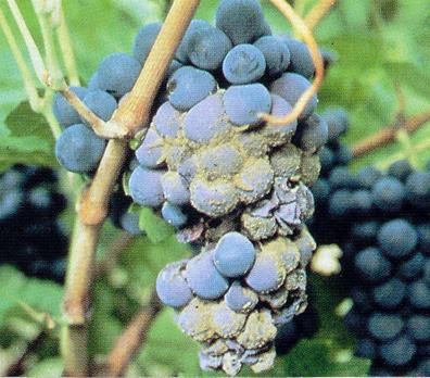 Bağda kurşuni küf hastalığında, tanelerde yuvarlak, pembemsi, kızıla yakın lekeler halinde görülür. Leke büyüdükçe rengi de koyulaşır. Hastalık ilerledikçe salkım ve taneler gri renkte bir küf tabakasıyla kaplanır. Taneler çatlar, çok ileri devrede buruşur ve meşinleşmiş gibi bir hal alır.