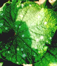 önce yapraklarda yağlımsı bir görünüş ve renk açılması meydana gelir, daha sonra yaprakların alt ya da üst yüzeylerinde unsu görünüşte, beyaz yüzeysel lekeler oluşur. Hasta yaprakların şekli bozulur.