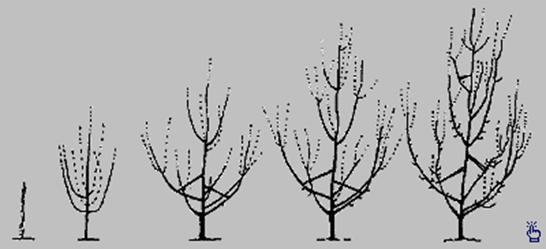 önceki yapılan işlemlere devam edilir. Her yıl ana dalların ve liderin ucundan 1/3 kesilir. Ağaç çeşidine, toprak ve iklim durumuna göre 8-12 ana dal olgun verim çağında bir ağaçta bulunmalıdır. Buna göre ihtiyaca göre 3. Bir kat da oluşturulabilir.