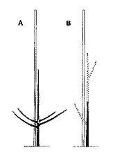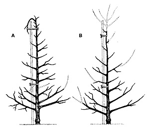 (A) Bir Vertikal axis sisteminde dikim için ideal bir ağaç. (B) Vertikal axiste dar açılı dallar çıkartılır ve zayıf dallı ağaçlarda lider dikimde geriye kesilir.