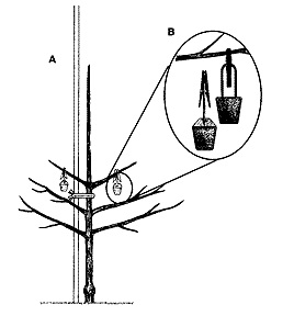 (A) Dallar birinci büyüme sezonunun haziran başlarında gövde ile 60 derecelik bir açıya açılmalı. (B) Dal açmada çamaşır mandalı ile tutturulan ağırlıklar kullanılabilir.