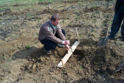e) Fidan yerlerinin işaretlenmesi ve fidan çukurunun açılması: Dikimden önce fidanların geleceği yerler dikim kazıklarıyla işaretlenir. Bu amaçla ilk olarak bir ip alınır. Bu ipin üzeri ağaçlara verilecek aralığa göre renkli bezlerle veya iplerle işaretlenir. Bundan sonra ip bahçenin üst kenarına düzgün bir şekilde gerilir. Bu hat çekilirken, sıra arası uzaklığın yarısı kadar olmak üzere bahçe sınırından içeriye girilir. İpteki işaret yerlerinin toprak üzerine düştükleri yerlere birer kazık çakılır. Bundan sonra ip kaldırılır ve daha önce çekilen ipe tam dikey gelecek şekilde tarlanın yan tarafına çekilir. Bu kısım da aynı şekilde işaretlenir.