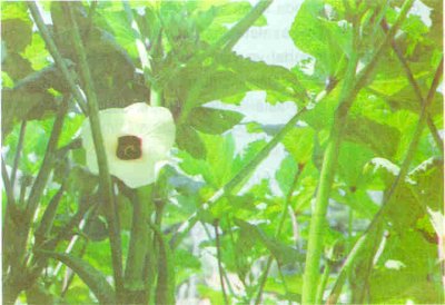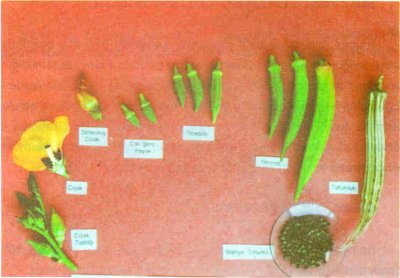 Şekil 8. Bamya bitkisinde tomurcuk, çiçek ve meyvelerin görünümü.