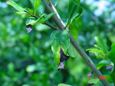 Hastalık ilkbaharda genç yapraklar çiçek ve küçük meyvelerde görülür. Yapraklarda küçük, koyu renkli, düzensiz ve koyu renkli lekeler oluşur.