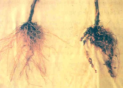 Şekil 10. Solda sağlıklı domates bitkisi kökleri Sağda nematod zararı görmüş domates kökleri.