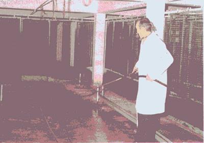 Kümes boşalınca tüm ekipman dışarı çıkarılır. Altlık kümesten uzağa götürülüp atılır. Sonra kümese ilaçlı sular püskürtülür. 24 saat sonra kümes tabanı kazınarak temizlenir, sıcak sodalı sularla fırçalanıp yıkanır.