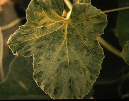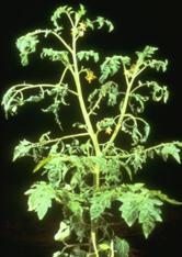 Resim 59. Virüsün kabakgil (solda) ve domates (sağda) yapraklarında oluşturduğu belirtiler.