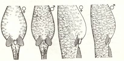 Kışı geçirmiş anaçlar , ilkbaharda cinsiyetlerine göre ayrılırlar . Ancak bu işlem cinsiyet dimorfiziminden dolayı kolay değildir . Sadece üreme mevsiminde belli olan cinsiyet özellikleri vardır . Bu özelliklerden birisi , genital papillanın büyüklüğü ve şeklidir . Dişinin papillası büyük ,geniş ve sıklıkla kırmızı uçlu bir çıkıntıdır .Buna karşın erkeğin papillası ise , basık ve biraz sivri uçludur ( Şekil 4 ) .