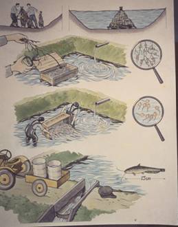 Yumurtadan çıkmış larva 2-4 lt / dak. su akış hızıyla 0.5 mm. göz açıklığına ve 30x40x60 cm. boyutunda plankton ağla çevrili kutulara bölüştürülür (Şekil 12 ). Her kutuya 10000-20000 adet larva stoklanarak ,muhafaza edilirler . Larvalar, oldukça hassas ve hasarlara karşı da oldukça duyarlıdırlar . Bu yüzden , yumurtadan çıktıktan sonra ,ilk gün rahatsız edilmeden korunurlar .