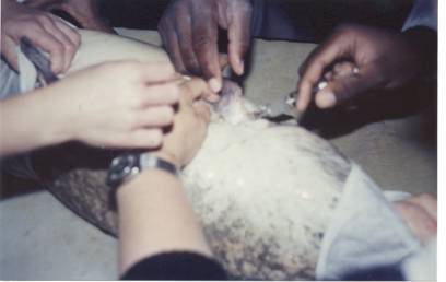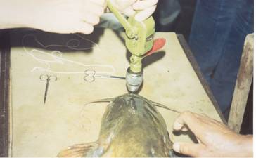 öncelikle anaçlar MS 222 veya Quinaldin gibi anastezik maddeler kullanılarak bayıltılırlar .Daha sonra Şekil 7 ‘de görüldüğü gibi , çene matkapla delinerek iple bağlanır .Bu uygulama ne solumayı ve ne de yumurtlamayı etkiler .