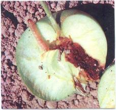 Şekil 13. Elma İç Kurdunun larvası ve meyvedeki zararı.